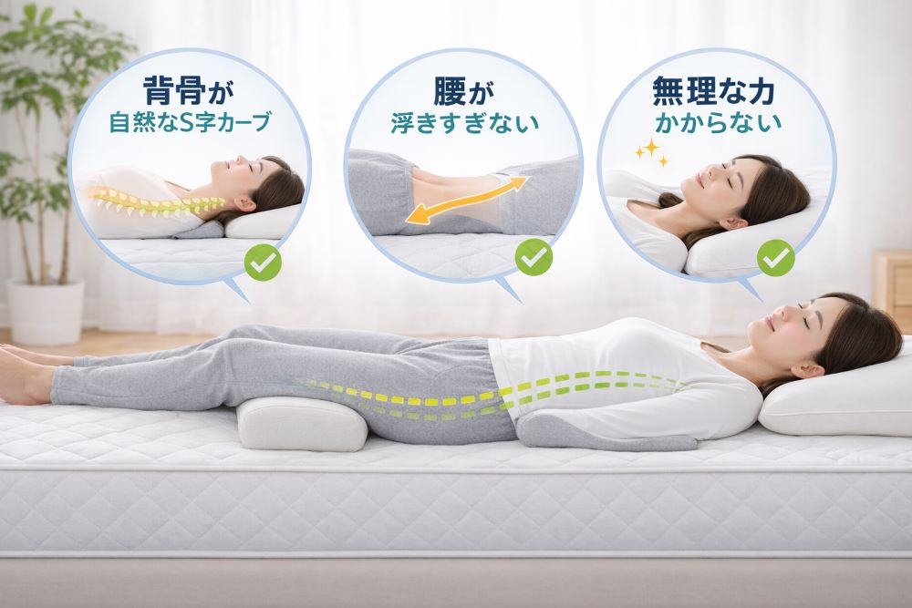 正しい仰向けの寝方を解説したイメージ|背骨のS字カーブと腰への負担軽減